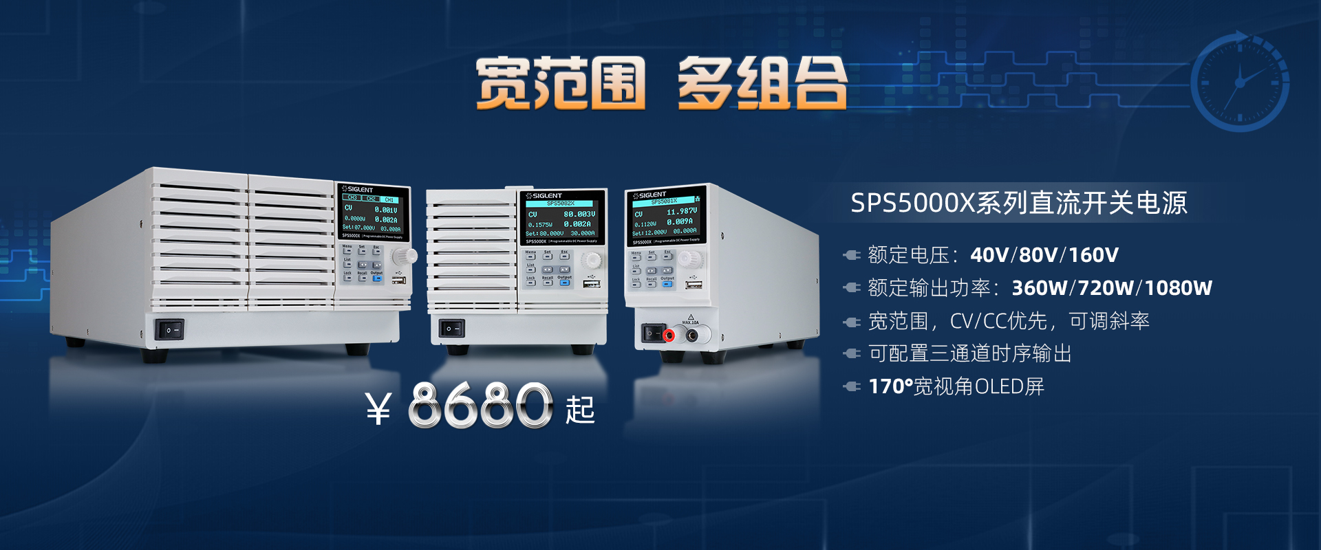 SPS5000X系列包含多種輸出電壓(40V,80V,160V)和電流組合(7.5A~90A),額定輸出功率包括360W,720W,1080W。單通道型號可支持...